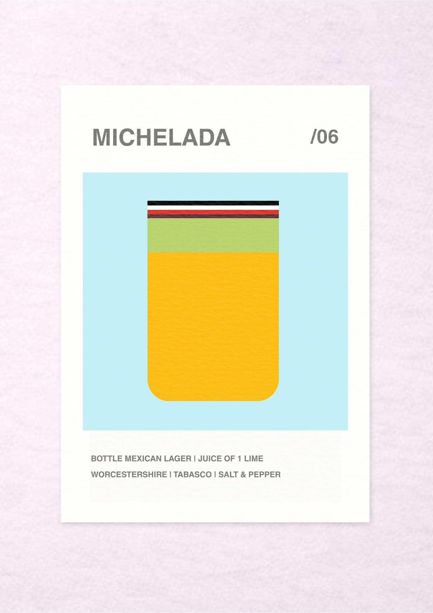 Sharp layers of black, white, red, lime green and golden lager sit within a tall, compact silhouette, capturing the drink's distinctive mix of heat, citrus and salt. The colour story is vibrant and unapologetic, setting this print apart from the softer classics around it.
